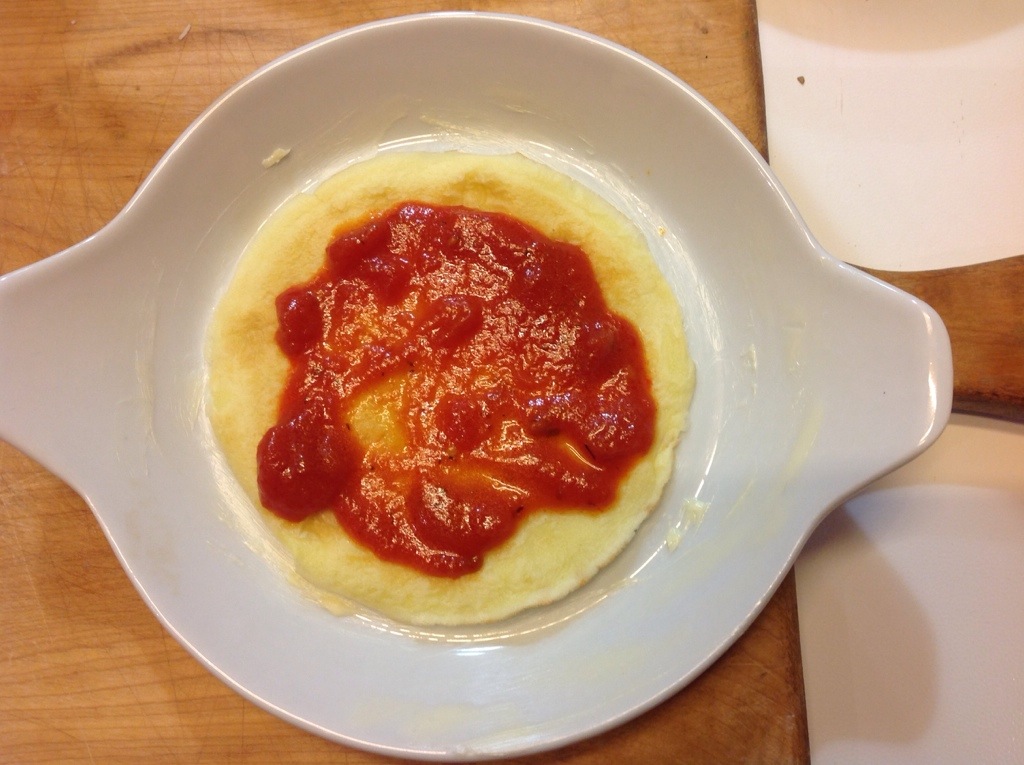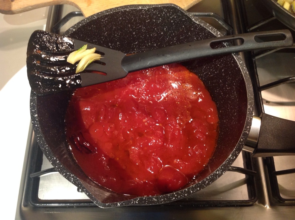 In un pentolino aggiungo poco olio, uno spicchio di aglio, un pezzetto di peperoncino quando è tutto rosolato verso i pelati schiacciandoli bene, sale e cuocio per una decina di minuti finché il sugo si è ristretto un po’, tolgo l’aglio e il peperoncino