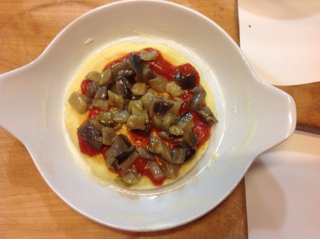Finisco con una crespella coperta con un cucchiaio di pomodoro, parmigiano, origano e un filo di olio, in ogni tortino utilizzo 4 crespelle