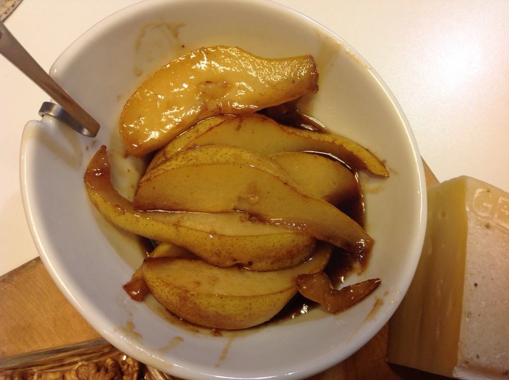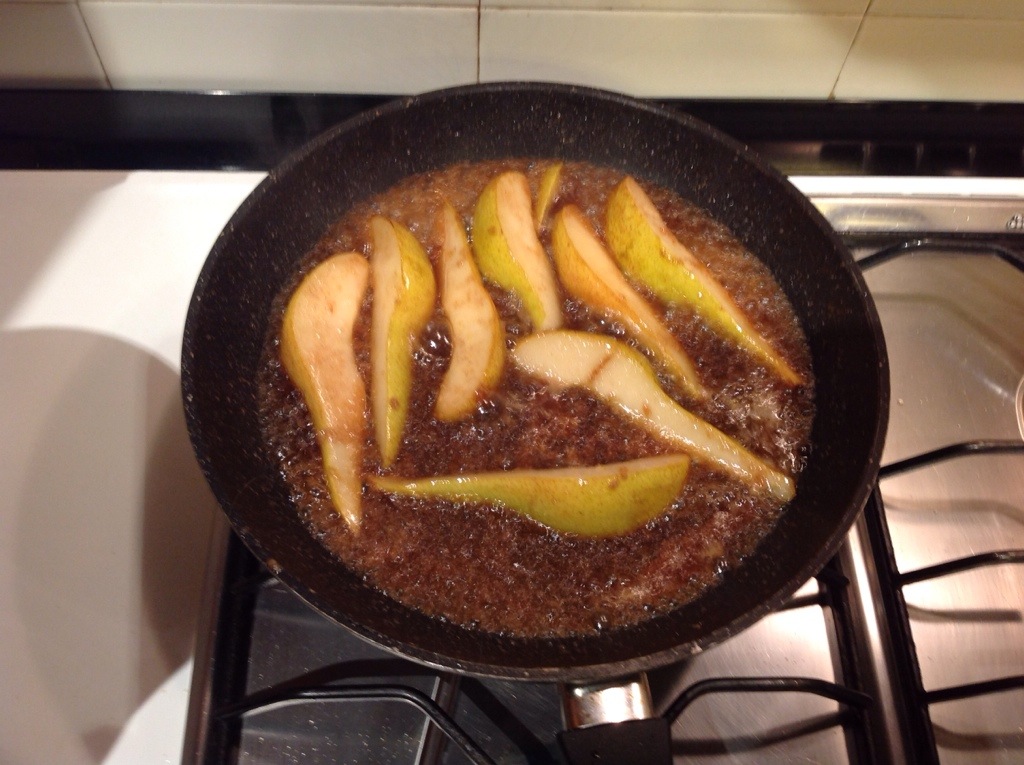 Aggiungo le pere, dopo un paio di minuti le giro delicatamente così da caramellarle da ambo i lati