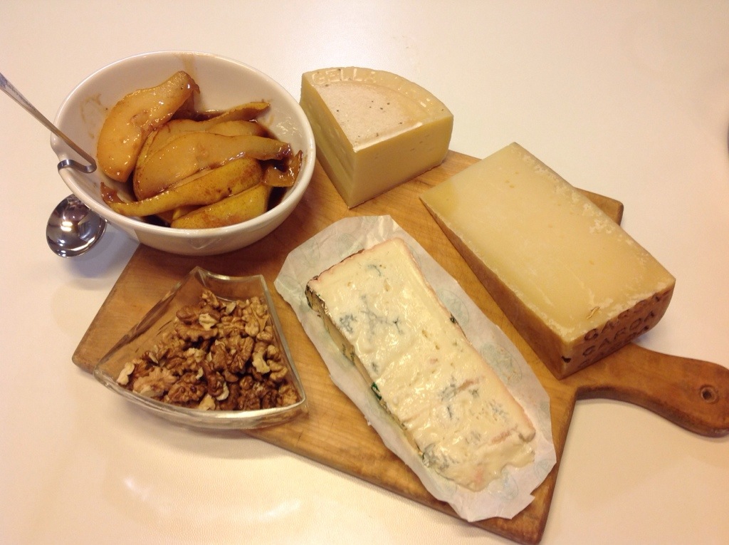 Verso le pere in una coppa con il loro sugo e servo con i formaggi e le noci già sgusciate