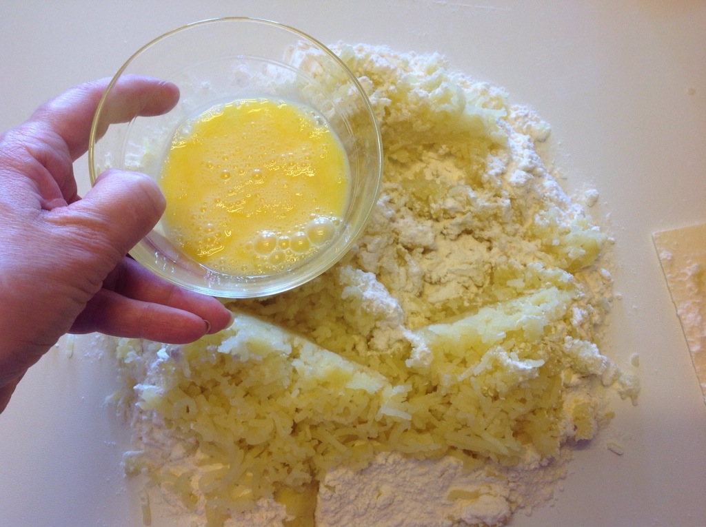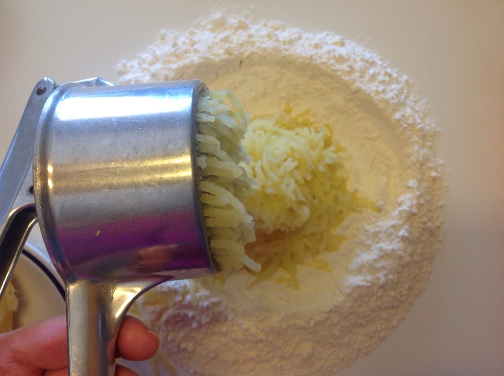 Con la farina preparo una cratere e schiaccio le patate con l’apposito attrezzo