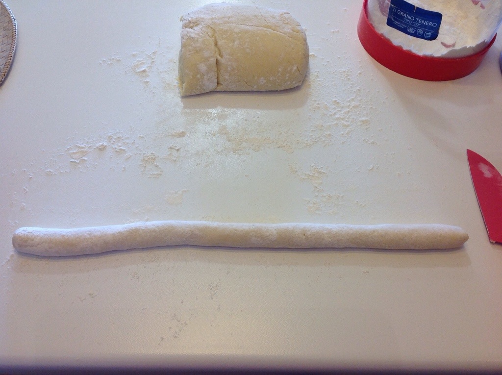 Taglio un pezzetto di impasto e lo arrotolo sul piano infarinato