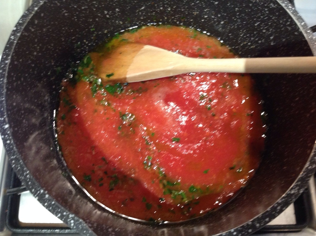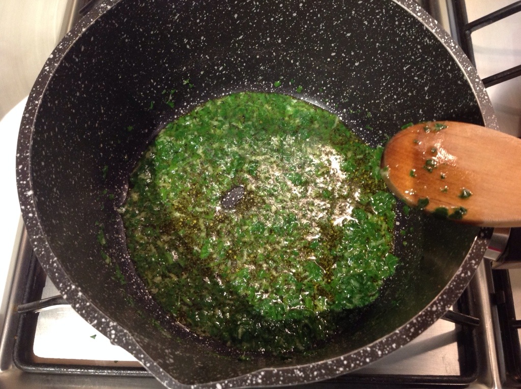 In pentolino lascio soffriggere uno spicchio di aglio una manciata di prezzemolo e dell’olio extravergine