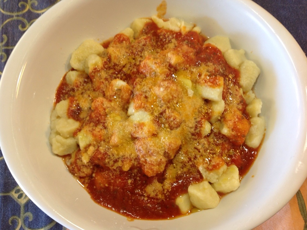 Sul fondo di una terrina metto uno strato di sugo, verso una piccola quantità di gnocchi, ancora salsa e parmigiano, alterno ancora altri strati finendo con abbondante parmigiano ed un filo di olio