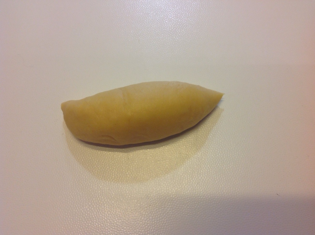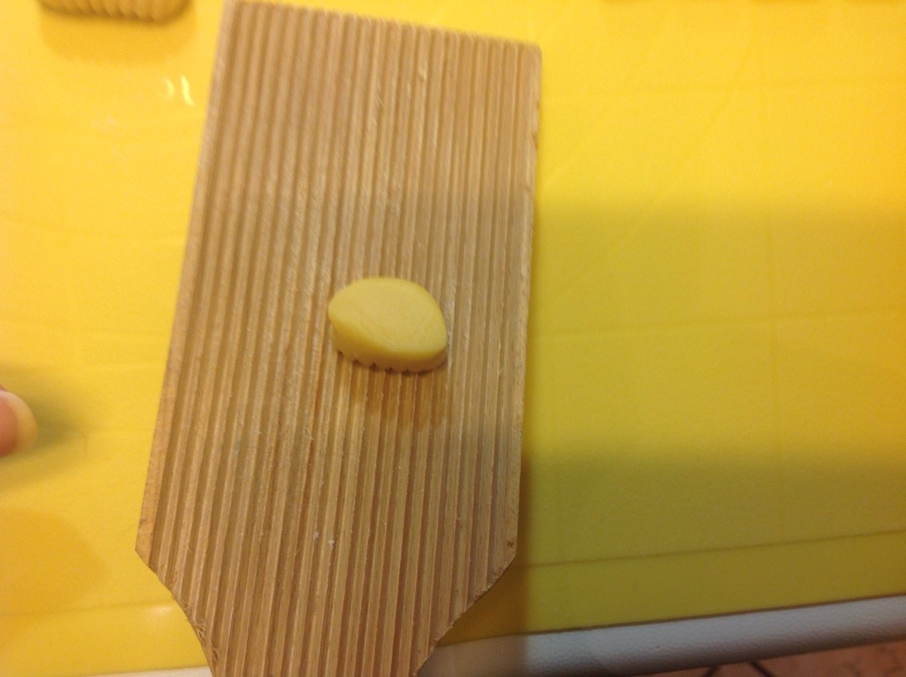 Con il pollice schiaccio leggermente la pasta facendola rotolare sul’asse