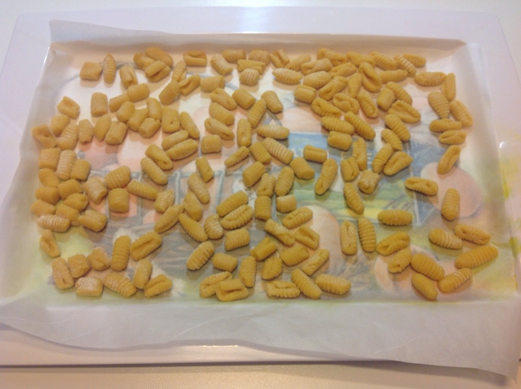 Preparo tutti i gnocchetti e li appoggio su un vassoio ricoperto di carta forno e farina di semola