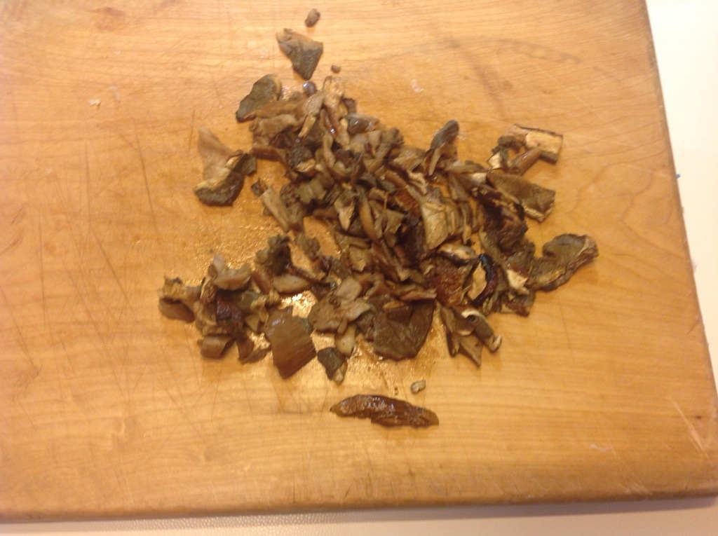 Prendo i funghi che avevo precedentemente messo in ammollo in acqua tiepida, li strizzo e li trito grossolanamente a coltello