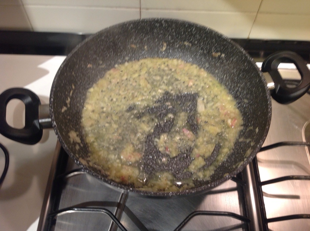 In una larga padella aggiungo un goccio di olio e gli scalogni tritati, aggiungo un paio di cucchiai di brodo e lascio stufare per 5 minuti