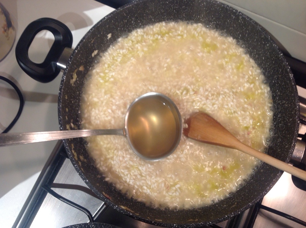 Porto quasi a cottura, aggiungendo sempre il brodo, ci vorranno dai 15 ai 18 minuti, tenetelo comunque al dente, non c’è niente di peggio che un risotto scotto