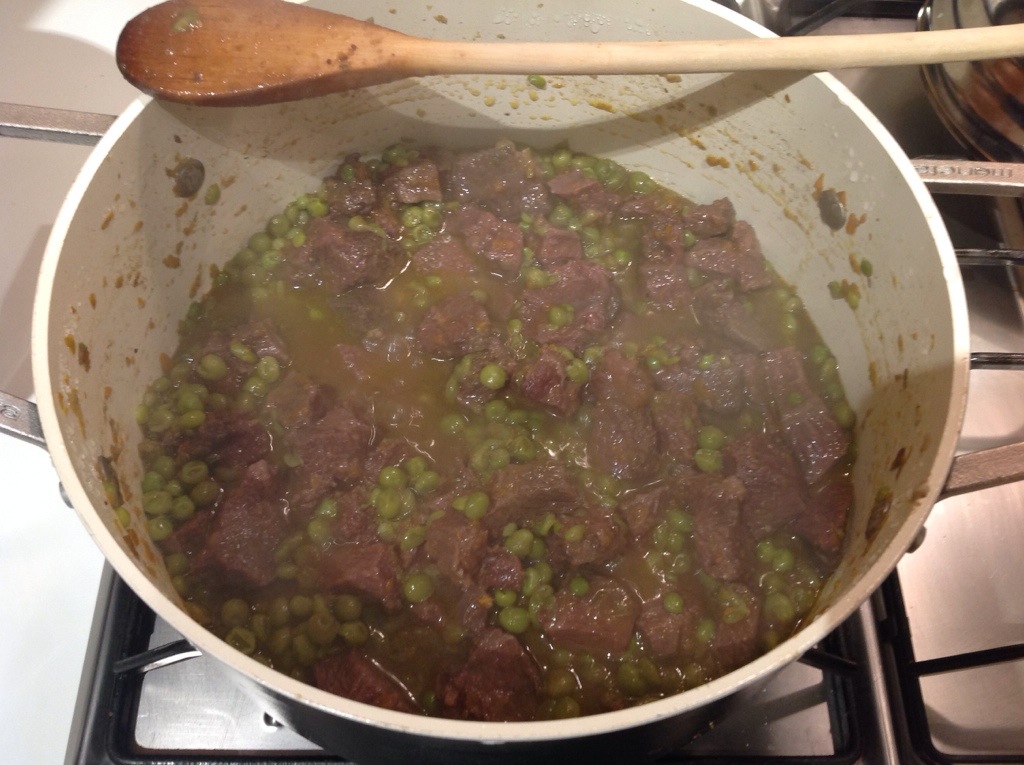 Trascorsa l’ora scopro e controllo se devo aggiungere ancora brodo, verso i piselli surgelati e cuocio ancora per mezz’ora
