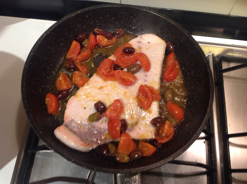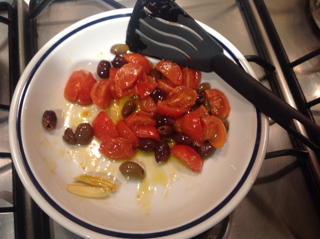 In una padella metto dell’olio extravergine e lo scaldo con l’ aglio, aggiungo i pomodorini, le olive e l’origano e li salto velocemente