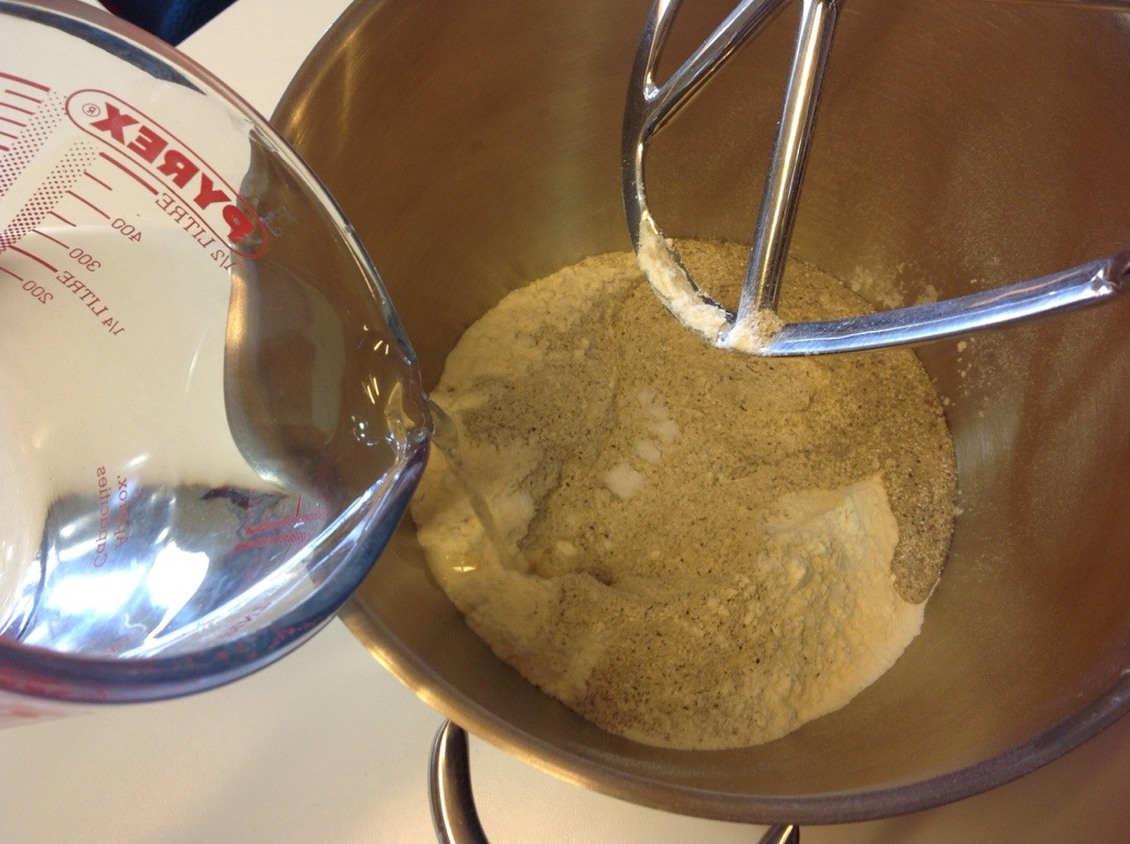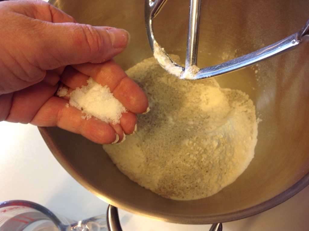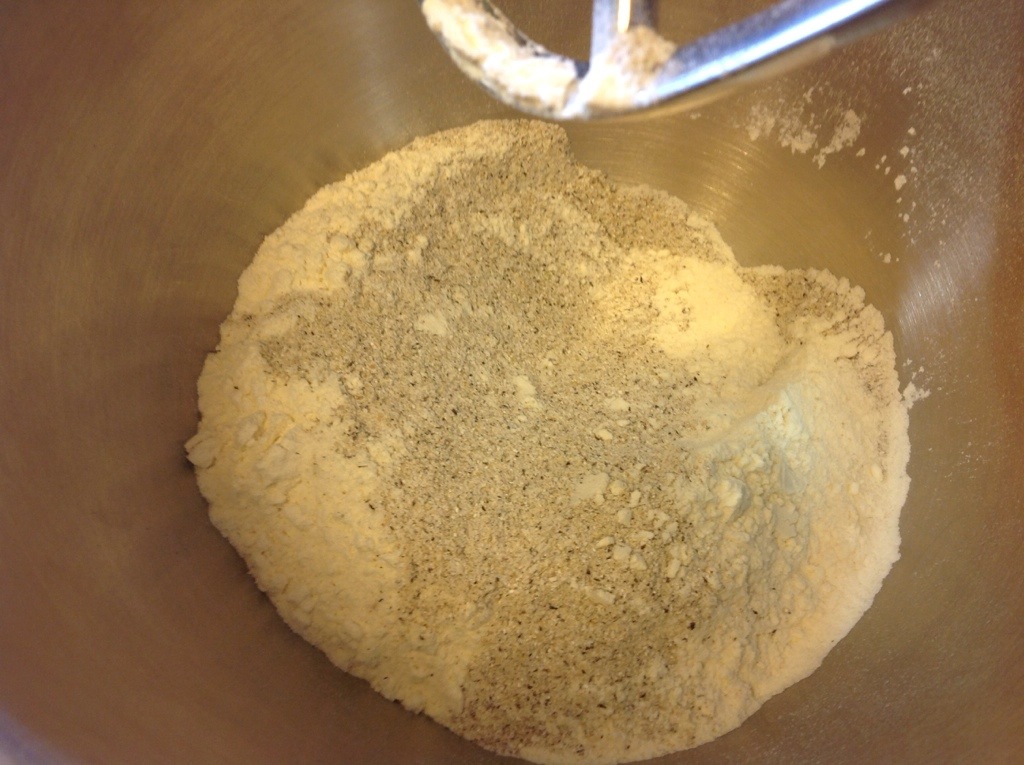 Mescolo le due farine, io ho adoperato l’impastatrice ma si può fare a mano