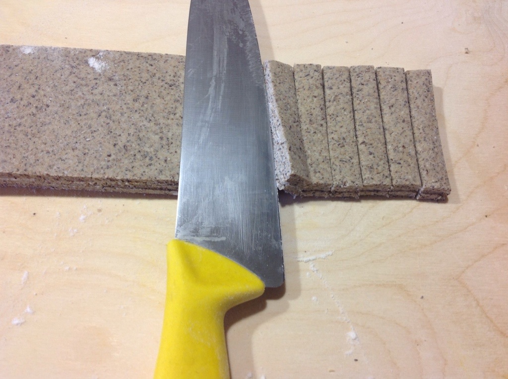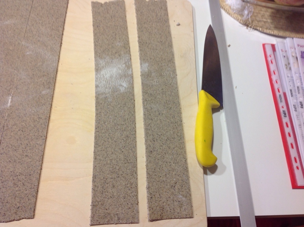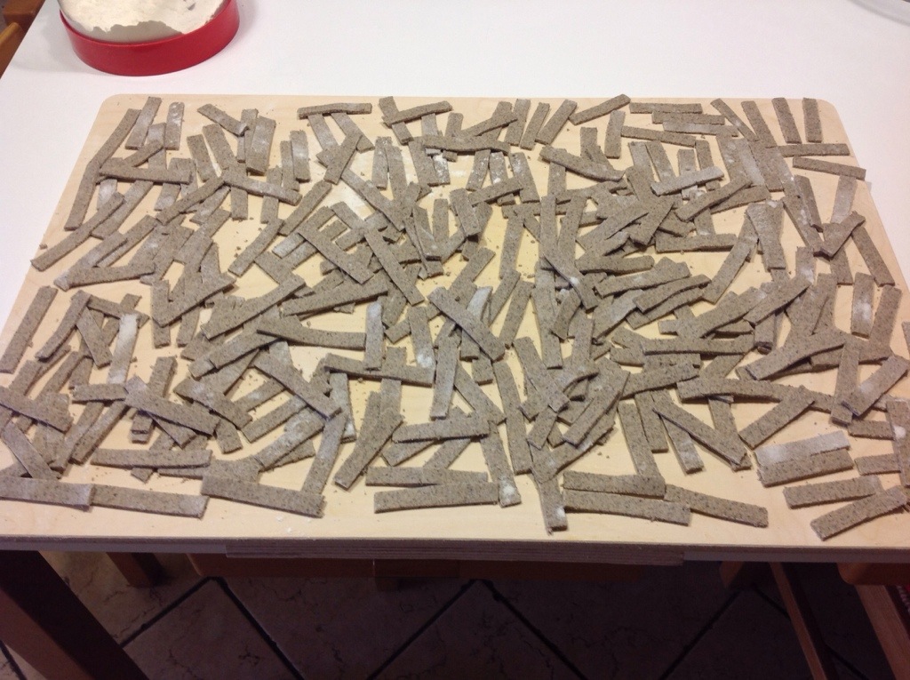 Sovrappongo due o tre strisce, le spolverizzo con poca farina e taglio delle striscioline di circa 1 cm