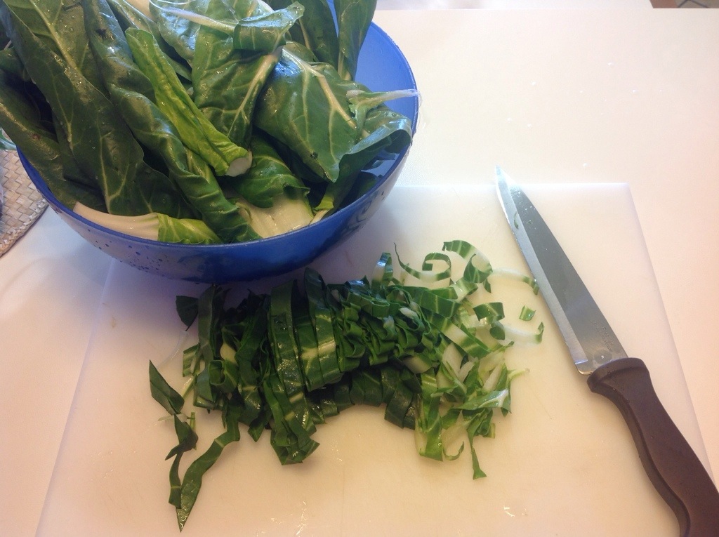 Preparo le foglie di bietole togliendo la coste centrale( che userò in un altra ricetta, non buttatele ) mentre la parte verde la taglio a striscioline
