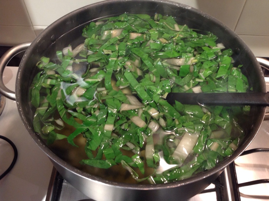 Metto a bollire una pentola con acqua salata, aggiungo le bietole e le patate e lascio bollire per circa 10 minuti