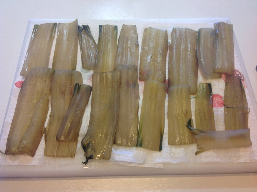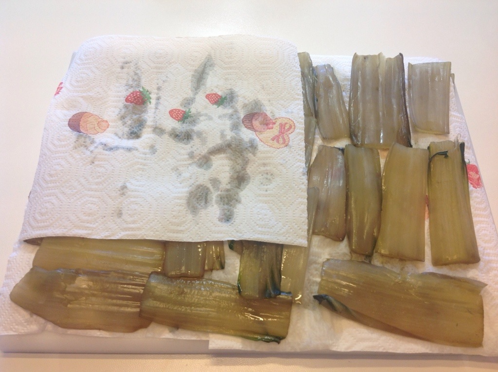 In una larga padella verso dell’olio di arachide e quando è caldo friggo i gambi appoggiandoli in un solo strato