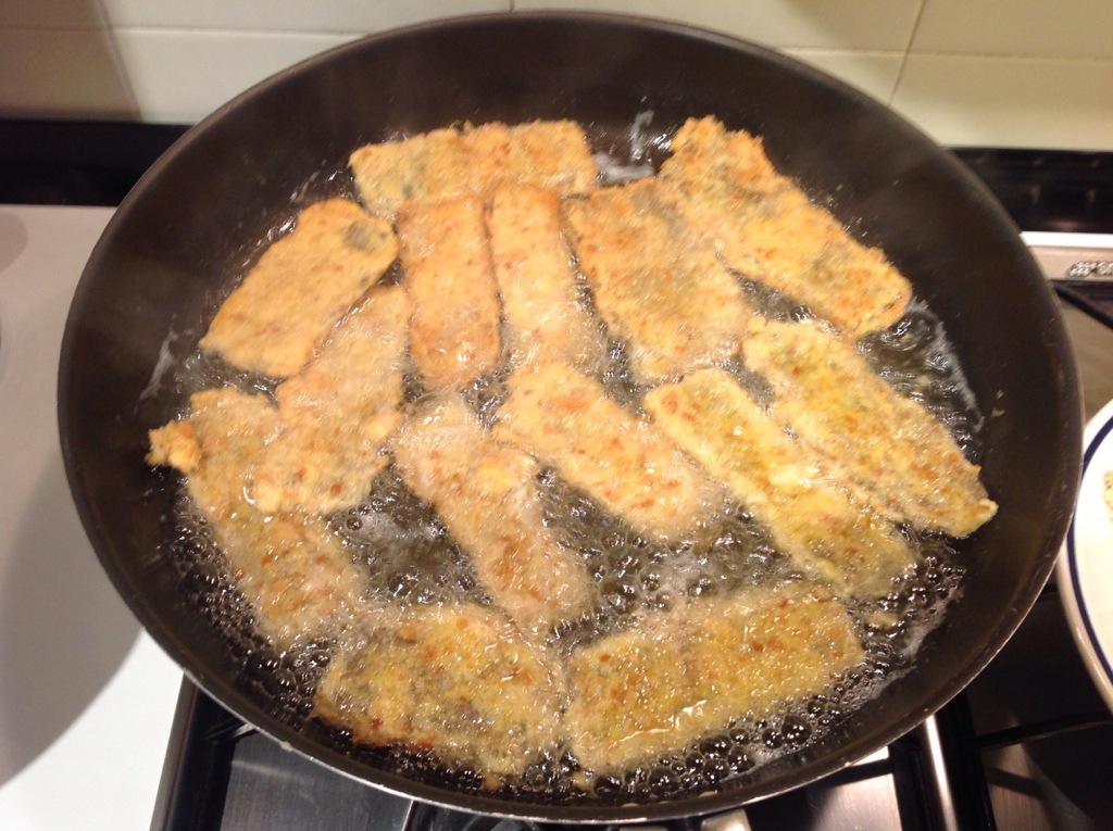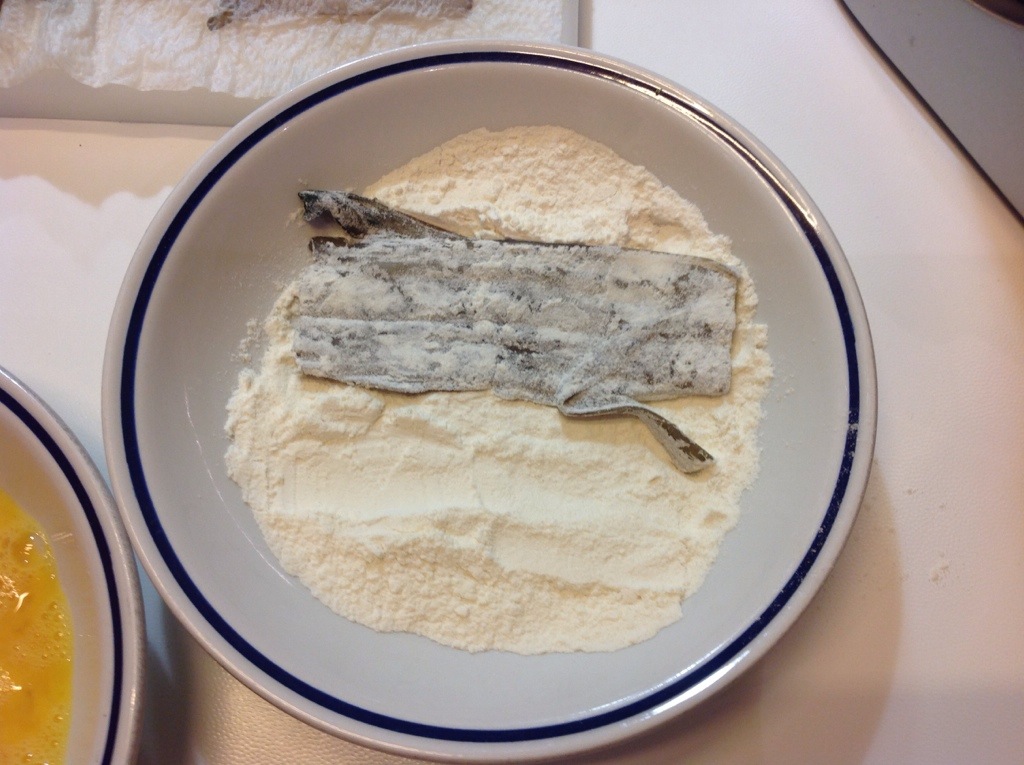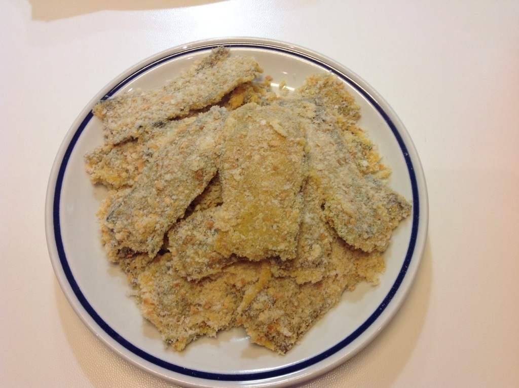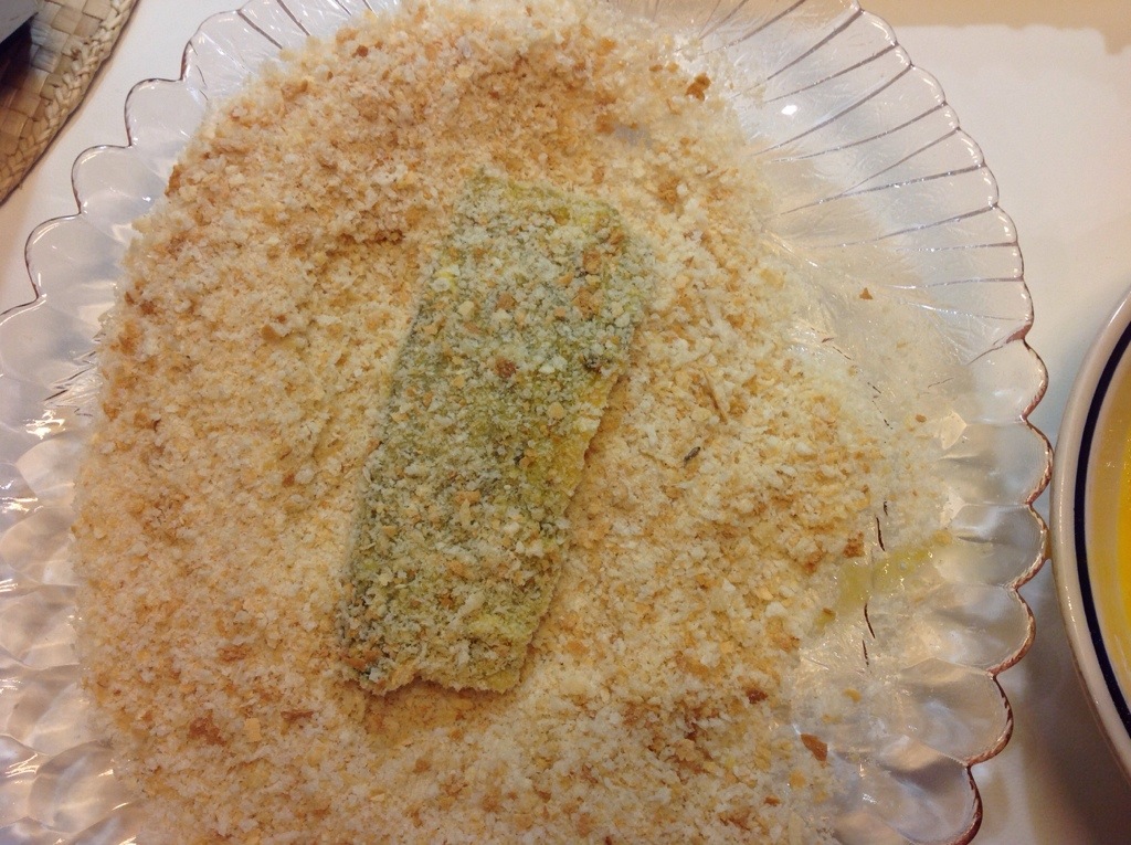 Preparo un piatto con farina bianca, in un altro 2 uova sbattute con poco sale, e in un altro del pane grattugiato, il procedimento è come per le cotolette alla milanese