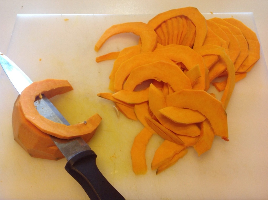Sbuccio la zucca, tolgo i semi e la affetto finemente