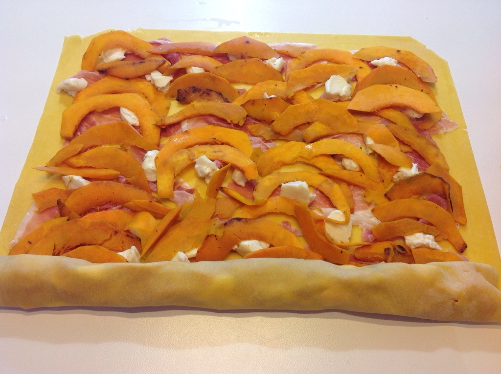 Ricopro tutta la sfoglia con le fettine di zucca ormai fredde