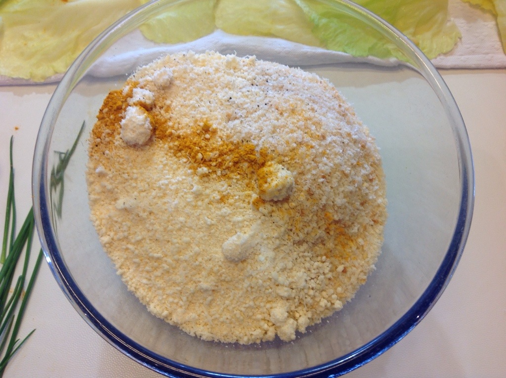 In una ciotola verso il pane grattugiato con il formaggio grattugiato e 1 cucchiaino di curcuma, sale, pepe