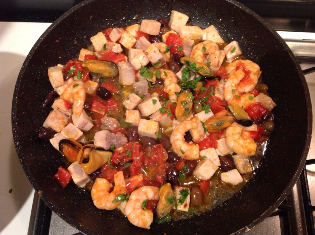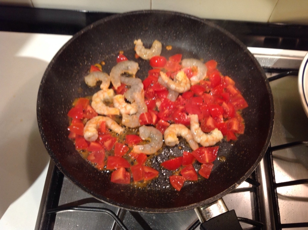 In un pentolino ho preparato il sugo facendo rosolare uno spicchio di aglio con olio extravergine, unisco i pelati spezzettandoli, macino del peperoncino e aggiusto di sale
