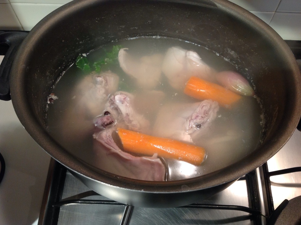 Lavo bene il coniglio in acqua fredda e lo aggiungo al brodo, il mio era a pezzi, meglio metterlo intero