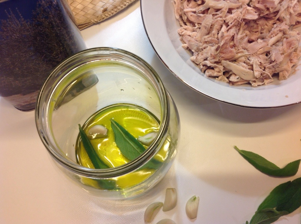 Metto dell’olio sul fondo di un vaso con alcuni spicchi di aglio sbucciati e tagliati e alcune foglie di salvia ben lavate e asciugate