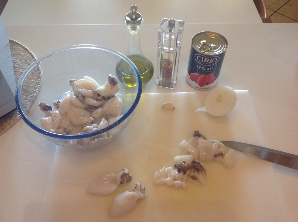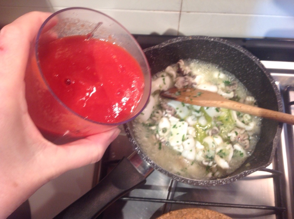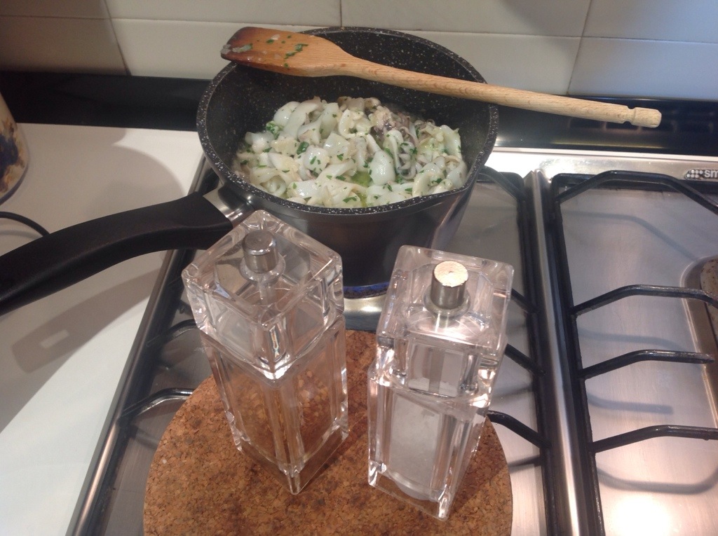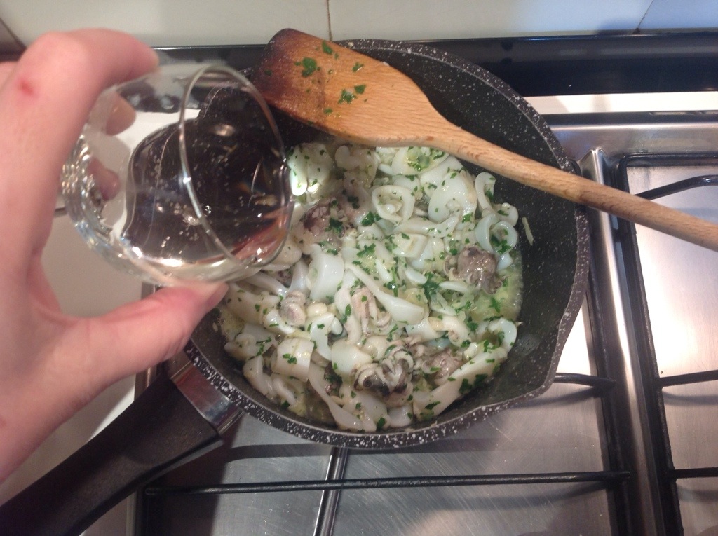 Quando è ben rosolato verso le seppioline dopo averle lavate molto bene sotto l’acqua corrente e tagliate a striscioline lasciando interi i tentacoli e mescolo bene