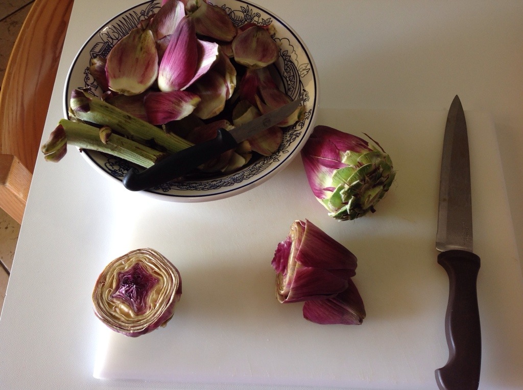 Pulisco bene i carciofi dai gambi e dalle foglie più dure e taglio la punta più dura