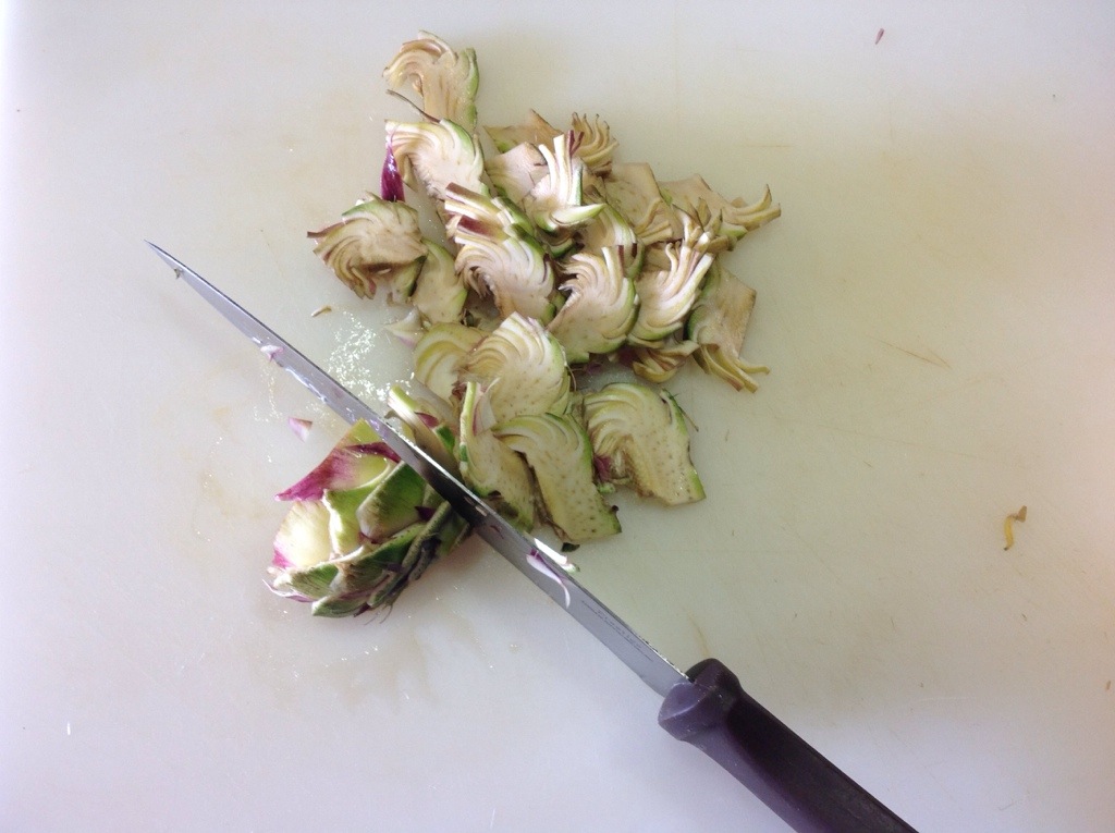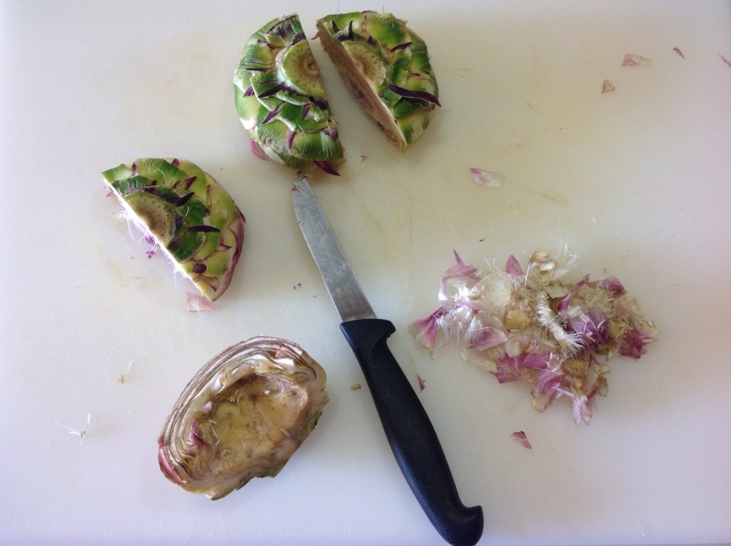 Taglio ogni fondo di carciofo in due pezzi ed elimino la “ barba ” con un coltellino