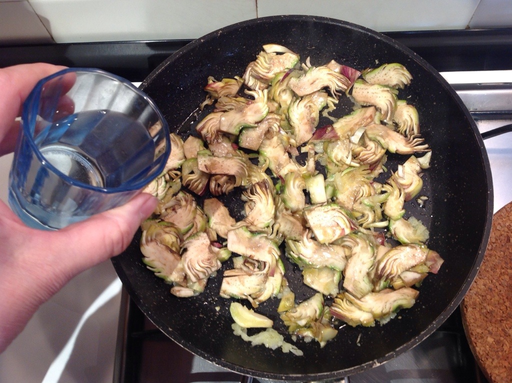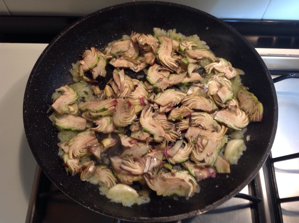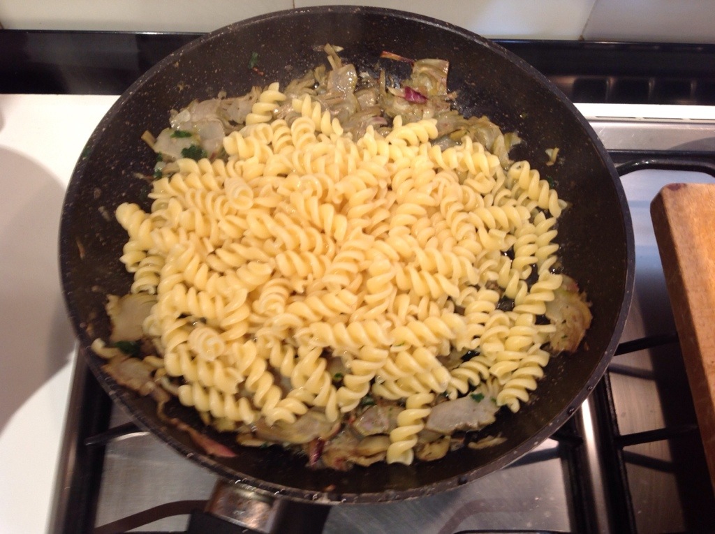 Cuocio la pasta e la scolo al dente e piuttosto bagnata nei carciofi