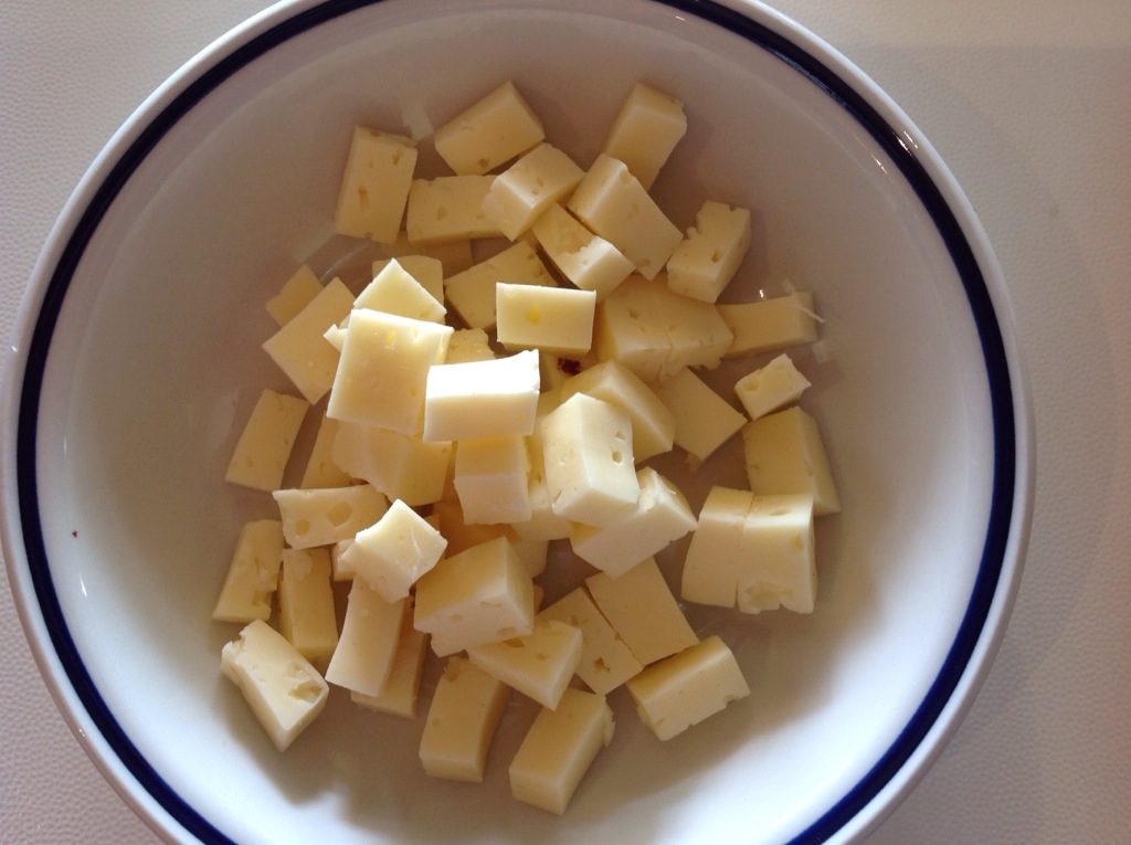 Taglio a dadini la scamorza e grattugio il parmigiano