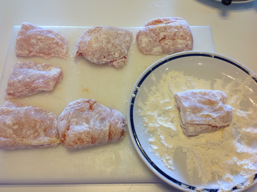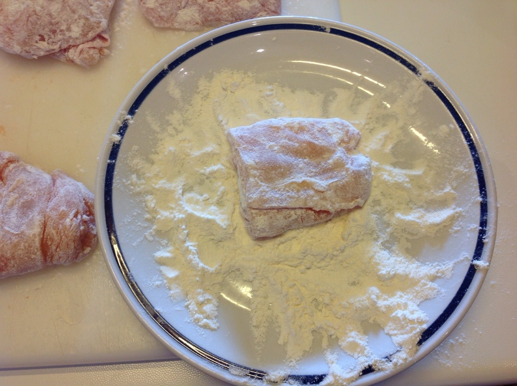 Metto in un piatto della farina bianca e li passo bene facendo aderire bene la farina