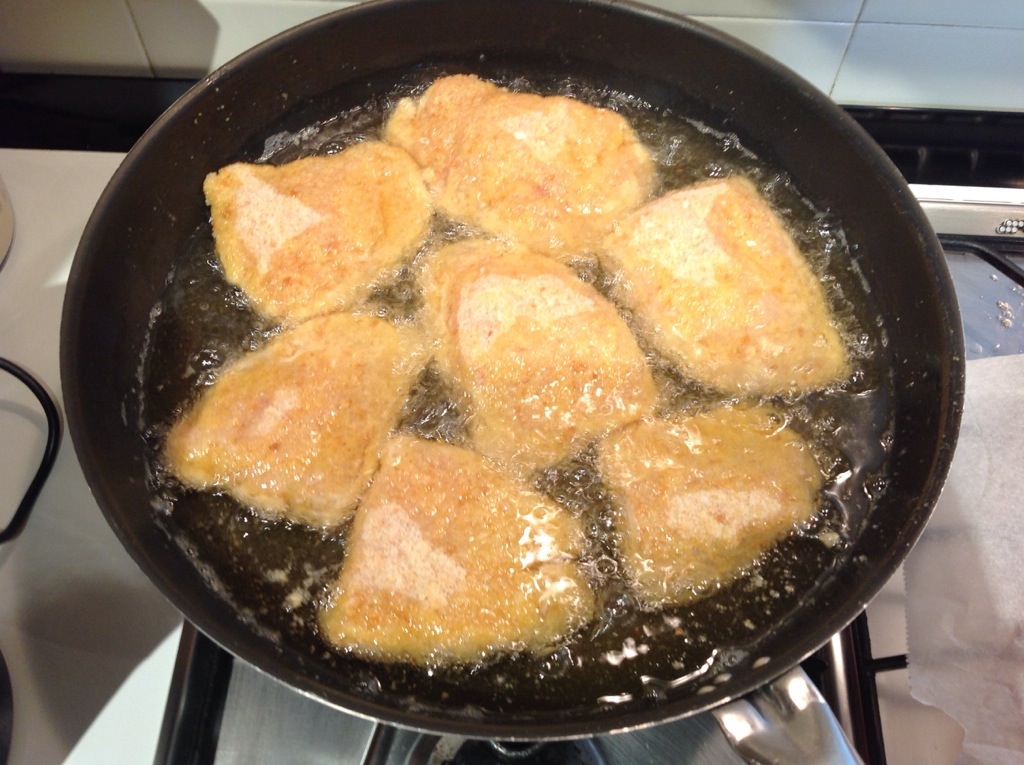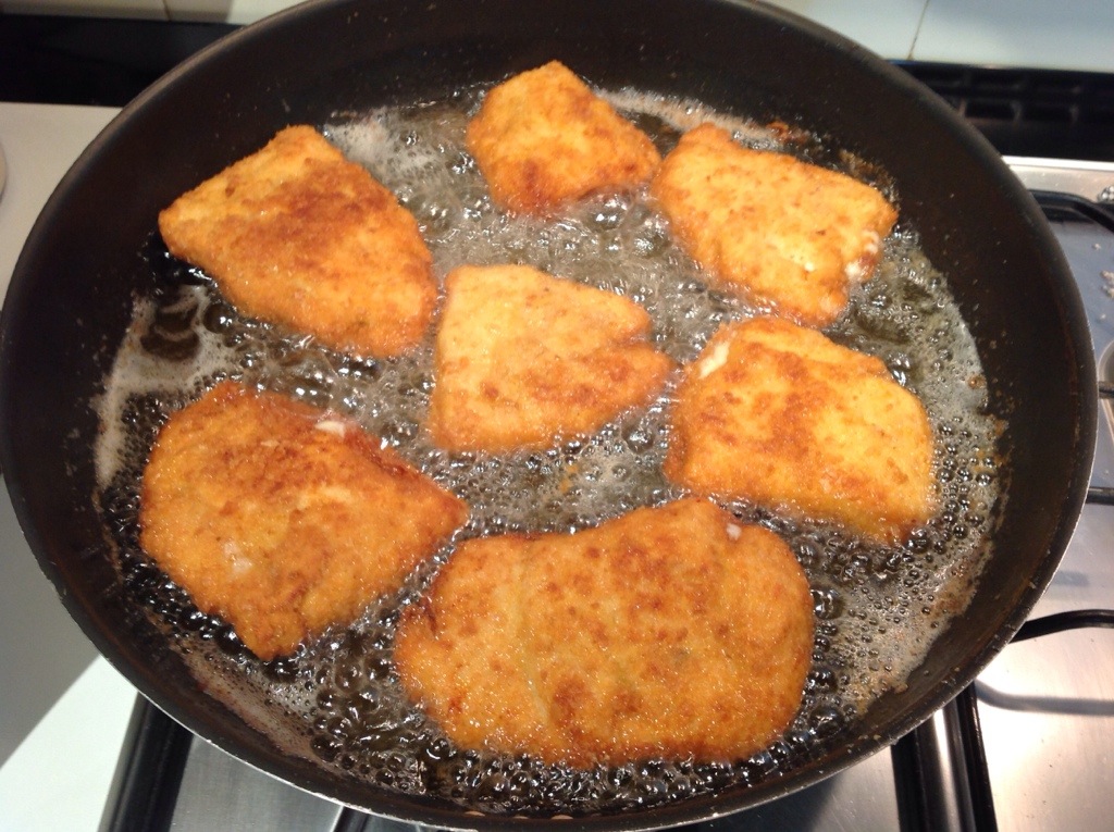 In una larga pentola aggiungo l’olio di arachidi e lo scaldo, quando è in temperatura unisco gli involtini, non tengo la temperatura troppo elevata , devono cuocere senza bruciare, essendo un po’ alti bisogna lasciare il tempo al formaggio di sciogliersi
