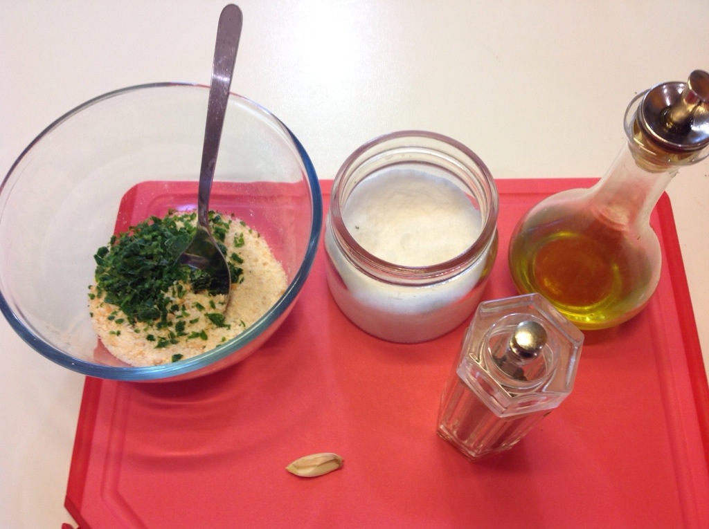 In una ciotola mescolo il pane, il formaggio, il prezzemolo tritato, lo spicchio di aglio tritato, sale, pepe e olio