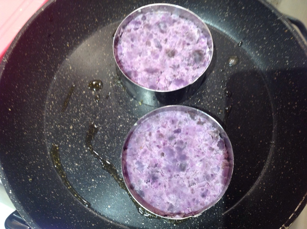 In una padella antiaderente verso pochissimo olio e lo scaldo e appoggio i tortini cuocendoli finché si forma una crosticina dorata, solo allora li giro e tolgo il coppapasta
