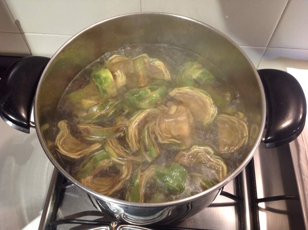 Porto a bollore una pentola con acqua, quindi immergo i fondi di carciofo pochi per volta, quando riprende il bollore lascio per 2/3 minuti