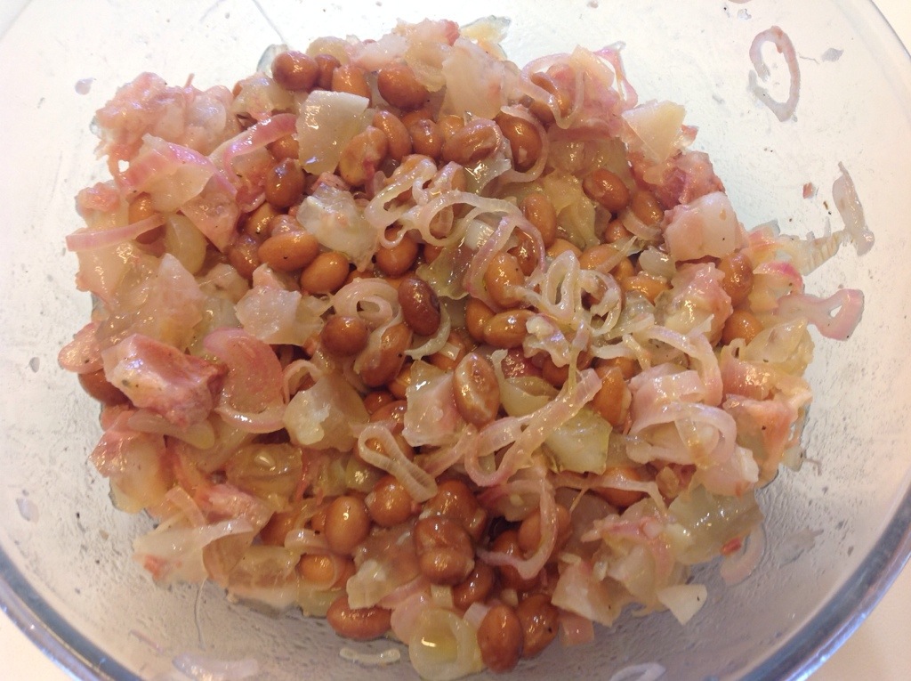 Aggiungo ai nervetti i borlotti dopo averli risciacquati sotto l’acqua poi gli scalogni che ho scolato e raffreddato