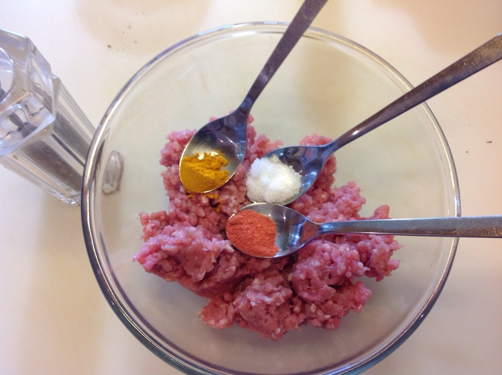 In una ciotola verso la carne, unisco un cucchiaino di curcuma, uno di paprica, un cucchiaino di sale e una macinata di pepe