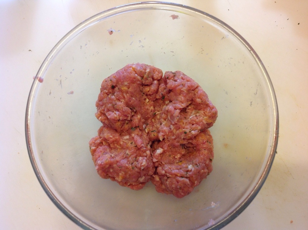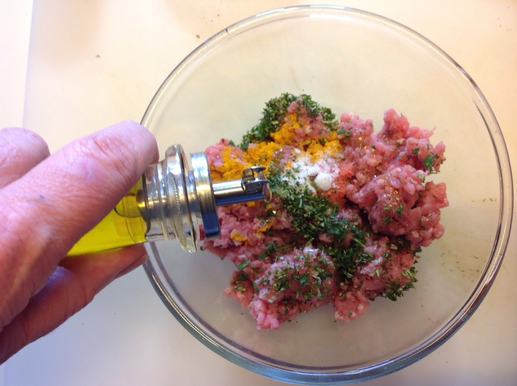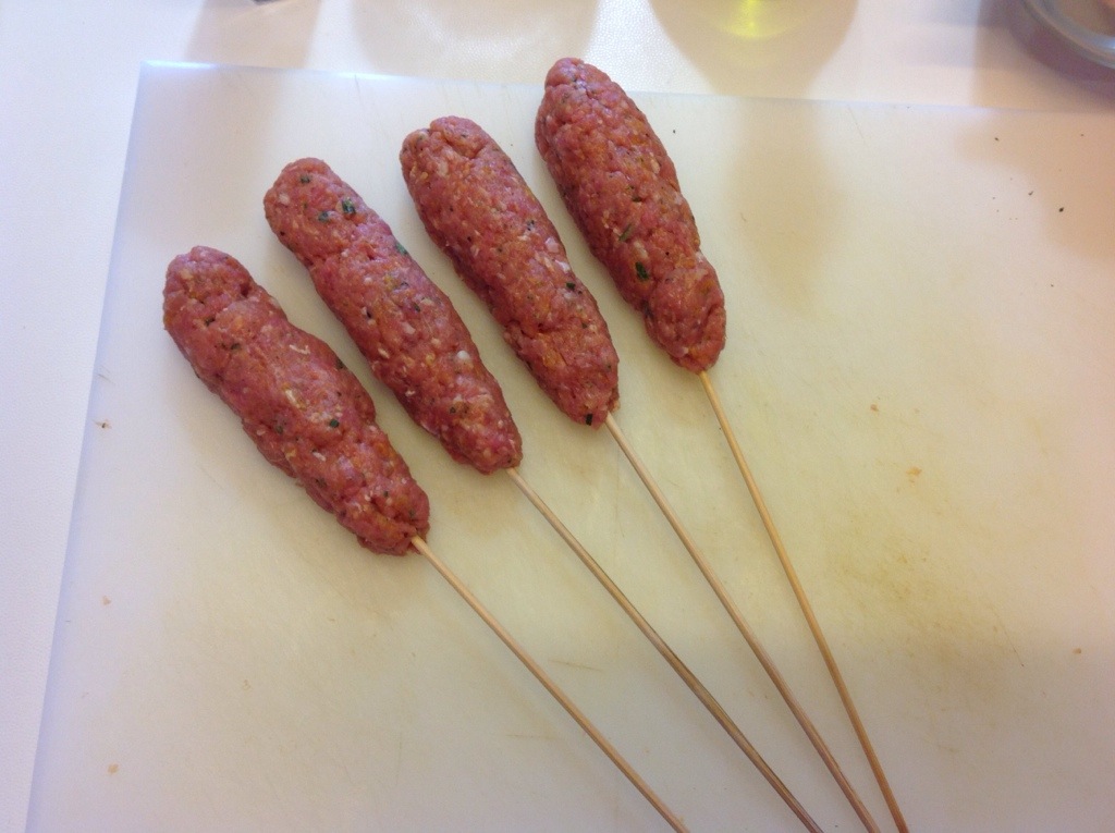 Ho suddiviso l’impasto in 4 porzioni, ma se volete per una cena a buffet potete fare gli spiedini molto piccoli, avvolgo la carne intorno agli stecchi di legno stringendo un po’, la carne deve rimanere attaccata ed avere una forma piuttosto allungata