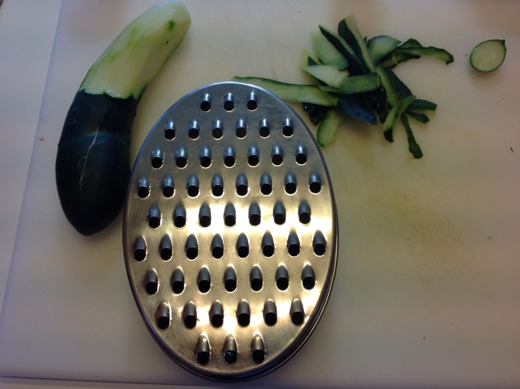 Sbuccio il cetriolo, alcuni lasciano la buccia, a me non piace e ne grattugio metà a grana grossa