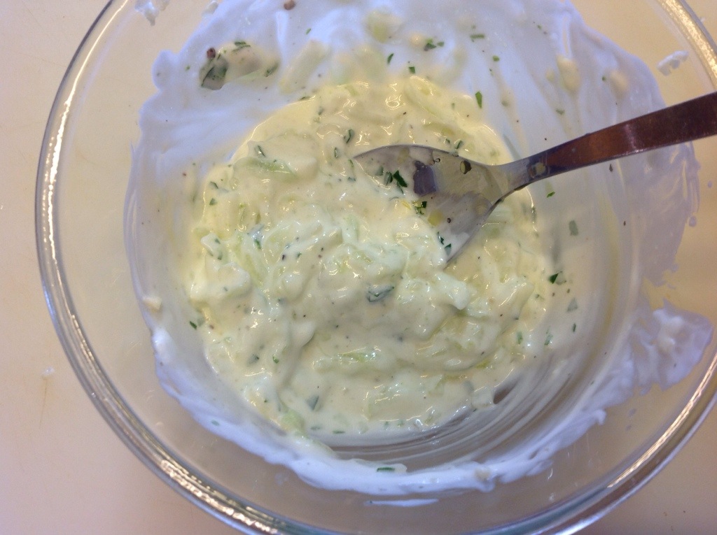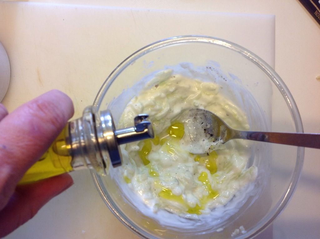 In una ciotola verso lo yogurt drenato, il cetriolo strizzato e una spicchio di aglio a cui ho tolto l’anima centrale e ho tritato finemente