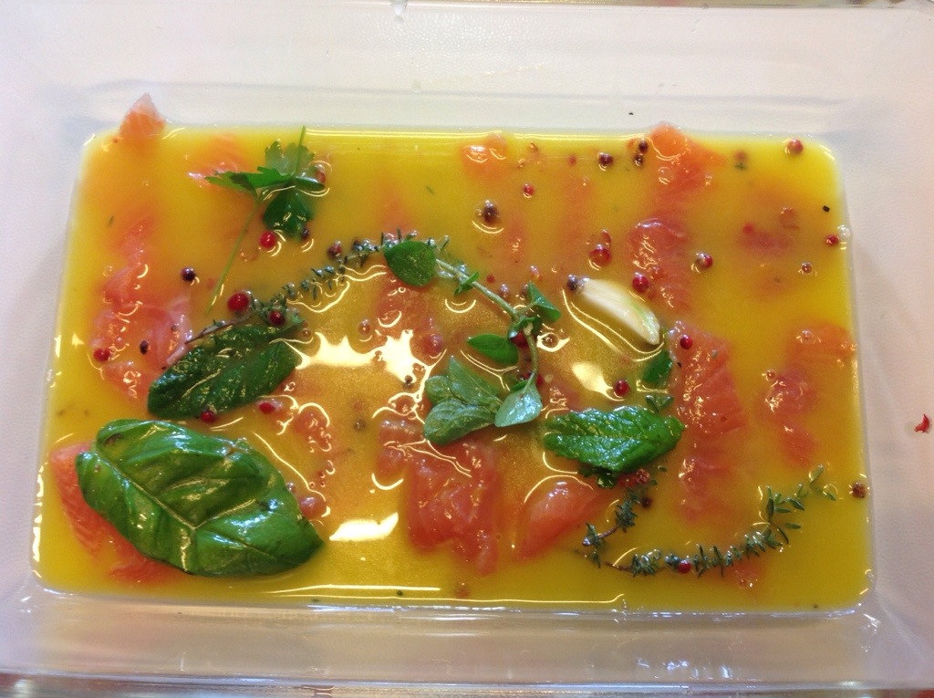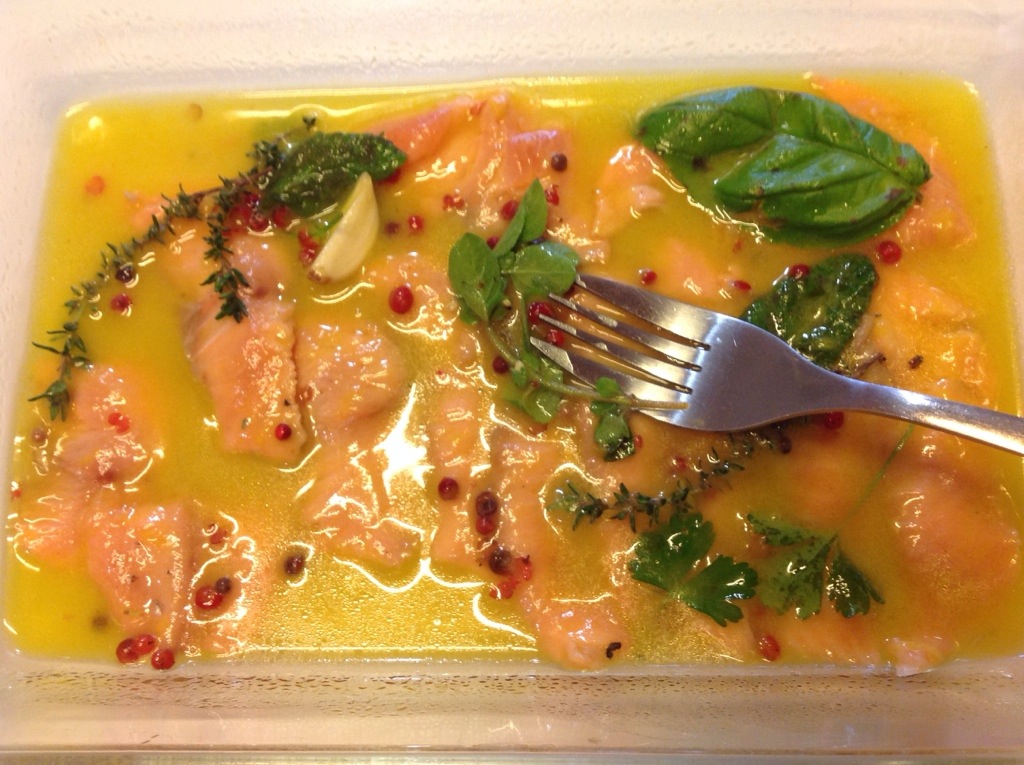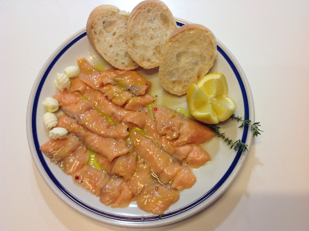 La scolo dalla marinata e la appoggio su un piatto, verso un filo di olio e servo con crostini e riccioli di burro