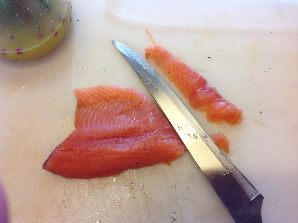 Con un coltello affilato affetto la trota sottilmente in modo trasversale