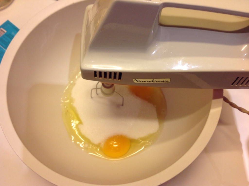 In una ciotola rompo le uova e unisco lo zucchero e monto con le fruste elettriche