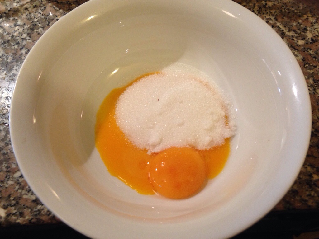 In una terrina metto i tuorli con i 50 gr di zucchero e li monto con le fruste elettriche finché sono chiari e spumosi