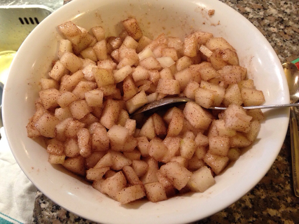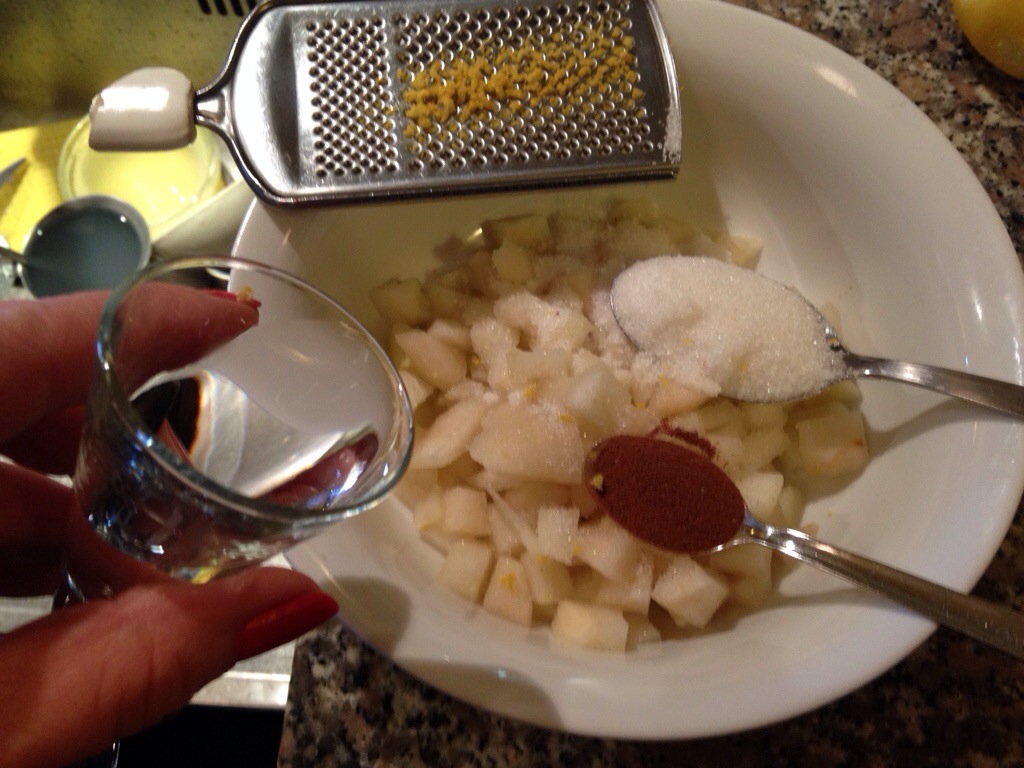 Sbuccio le pere e le taglio a cubetti, le metto in una ciotola con la buccia grattugiata del limone, il bicchierino di grappa , i due cucchiai di zucchero e il cucchiaino di cannella