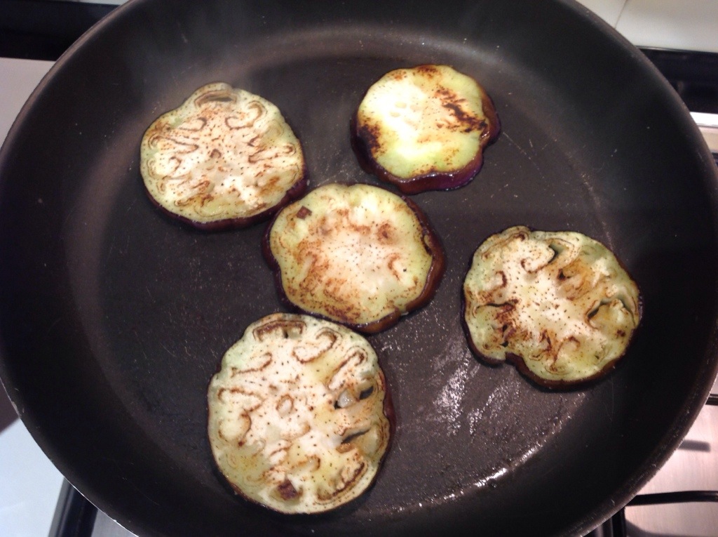 Aggiungo poco olio in una grande padella antiaderente quando è caldo sistemo le fette di melanzana in un solo strato e le arrostisco girandole spesso delicatamente