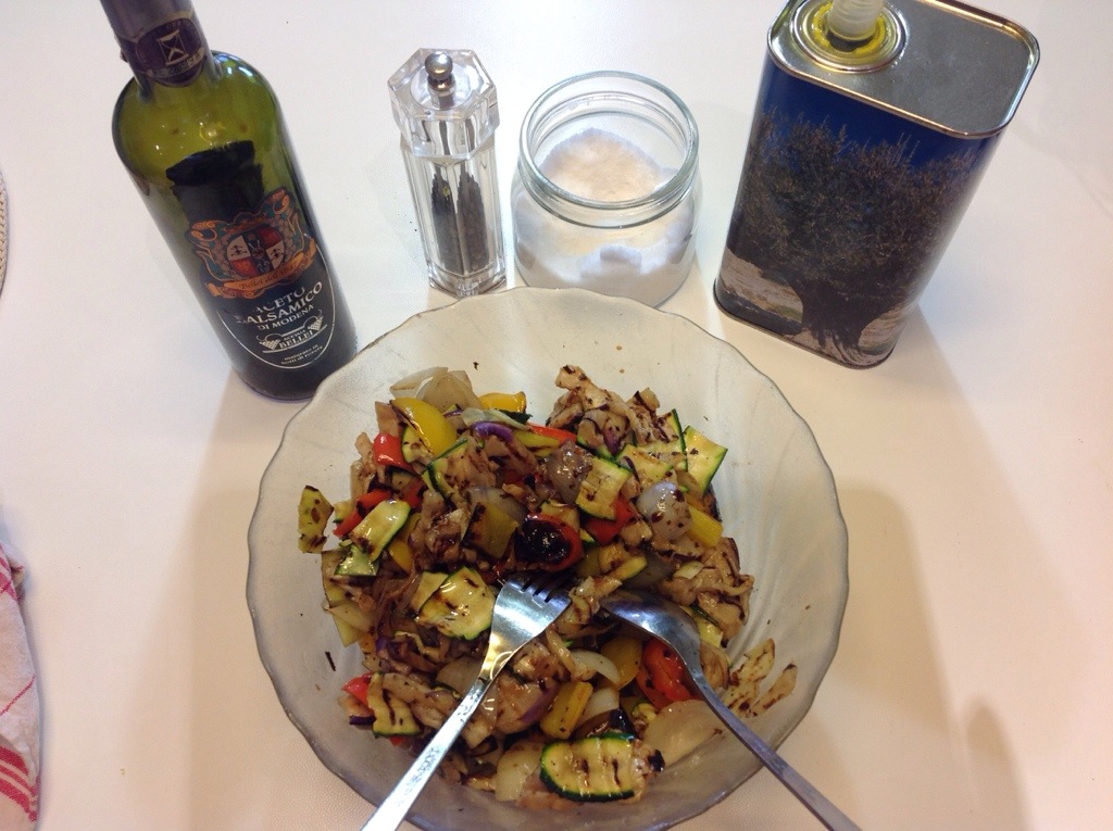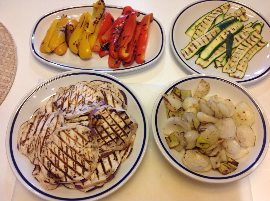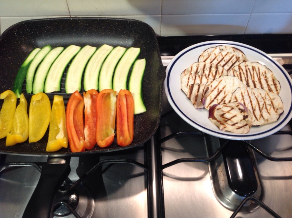 Pulisco e lavo le verdure, affetto le zucchine con una mandolina, sbuccio la melanzana e la taglio a fettine di mezzo centimetro, taglio a spicchi i peperoni e cuocio su una griglia calda