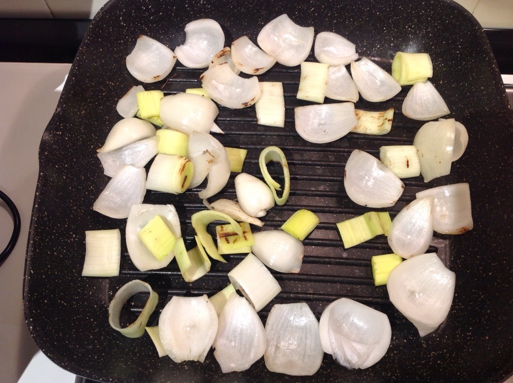 Taglio e pezzetti il porro e taglio la cipolla a fette sfogliandola e la faccio grigliare